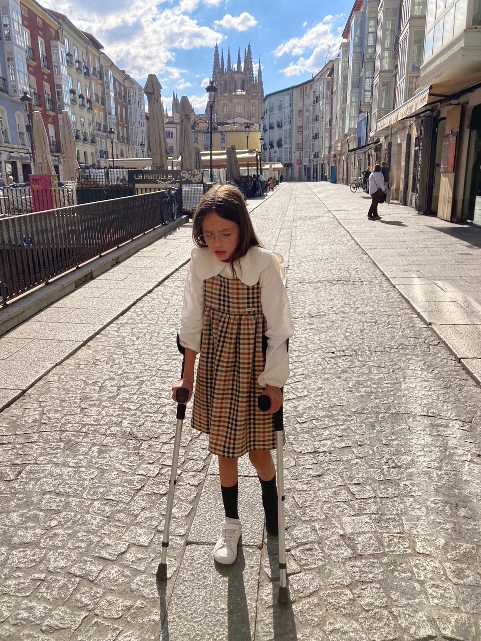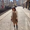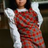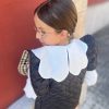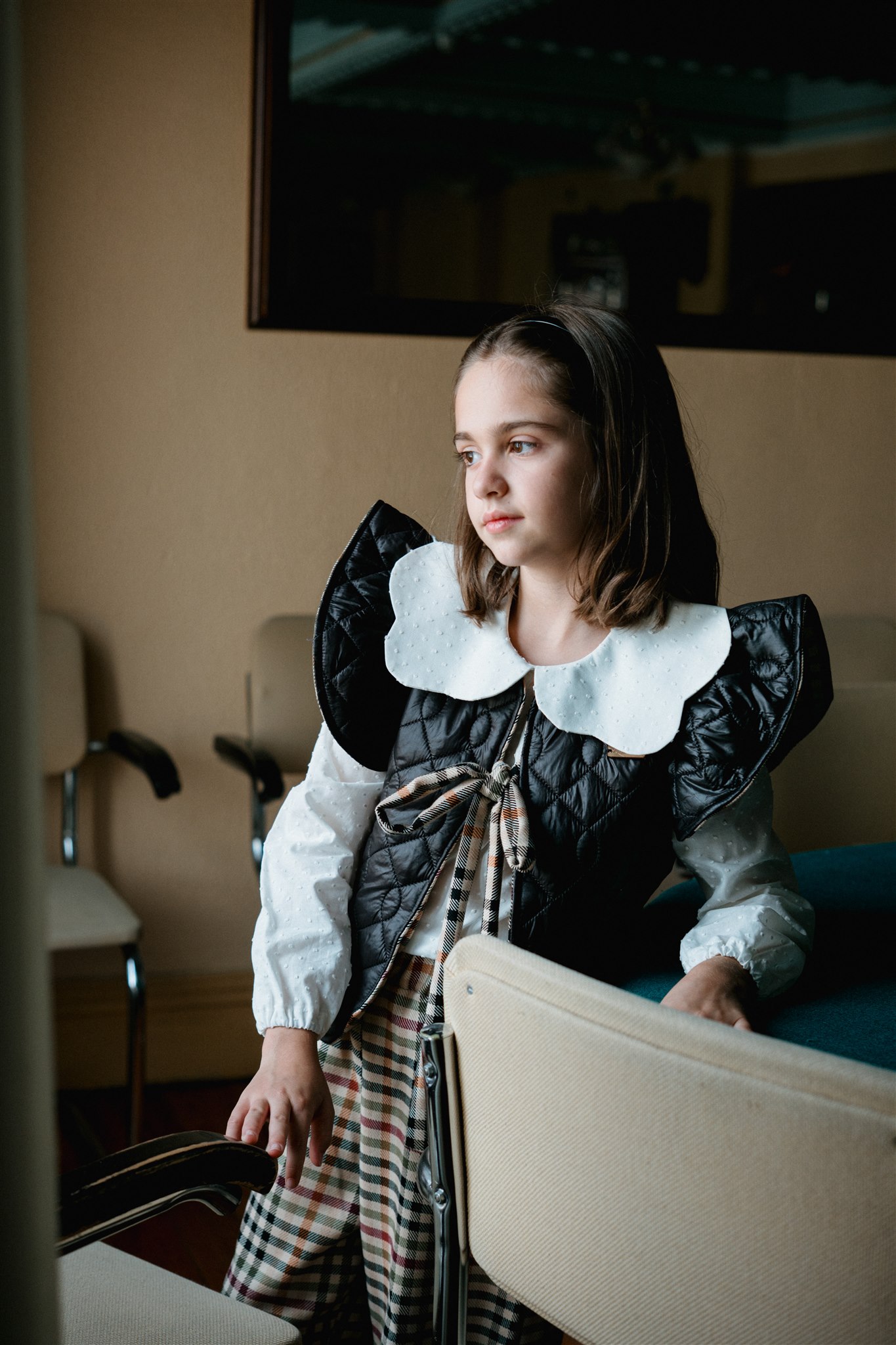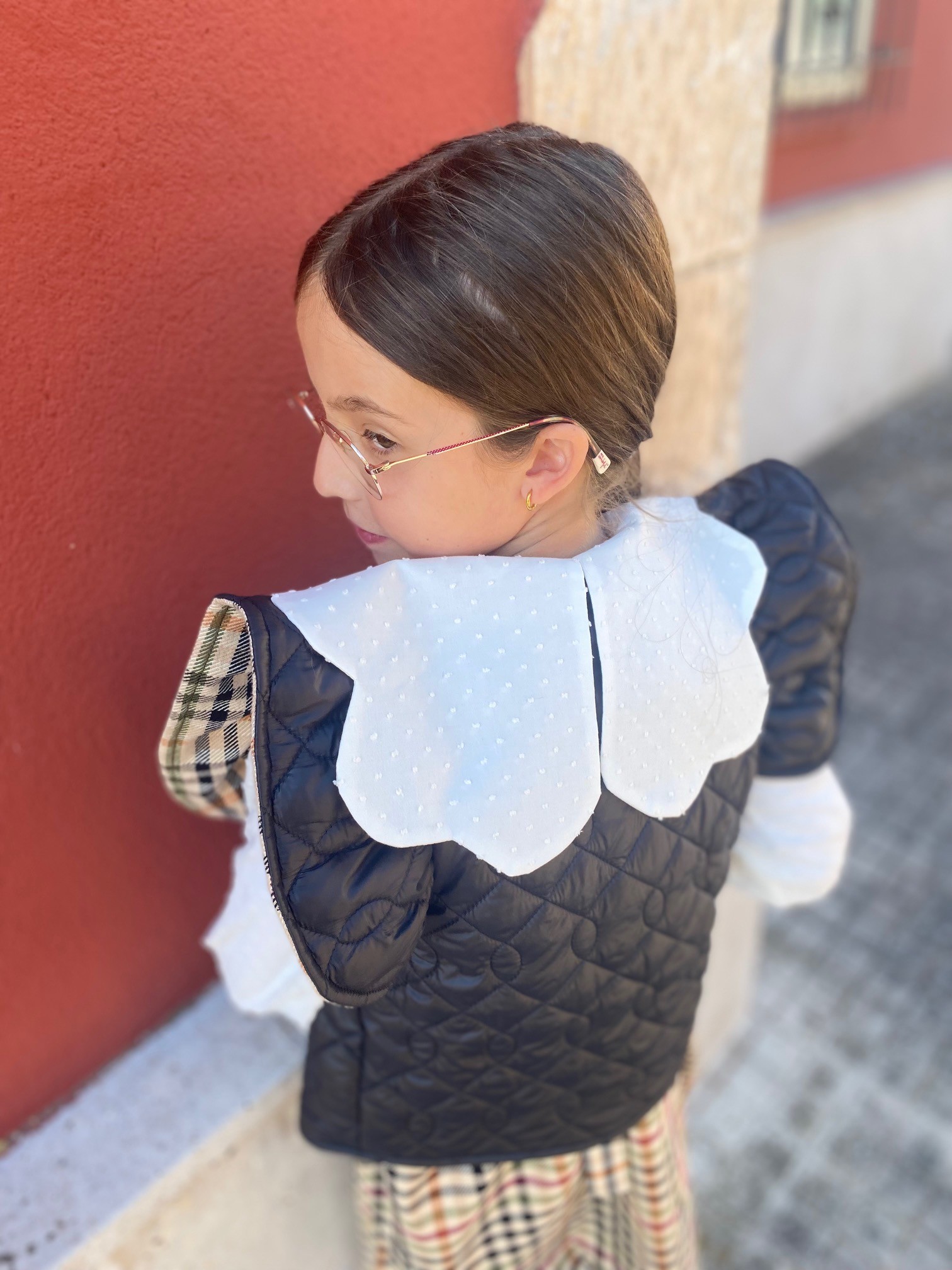 Blusa de plumeti crudo con gran cuello de ondas. Pliegue en el centro del delantero para mayor confort. Manga largas y puño con gomas. Abrocha a lo largo de la espalda con botones estampados.
