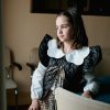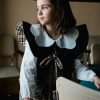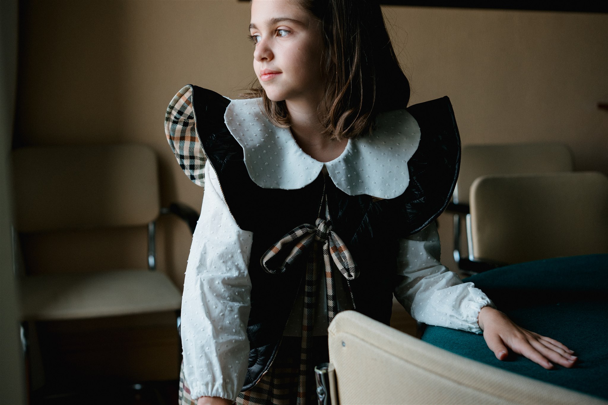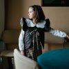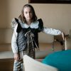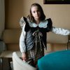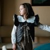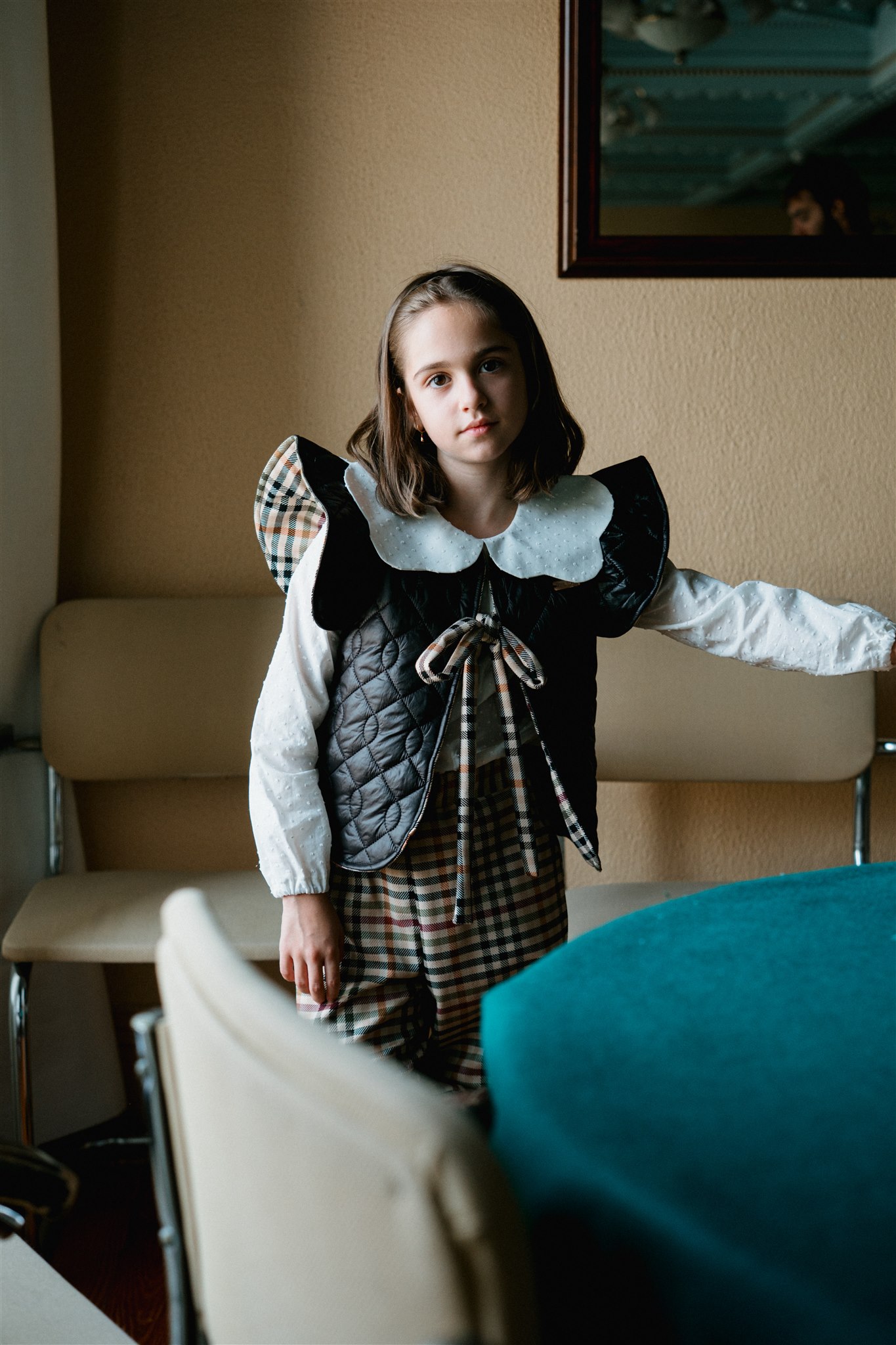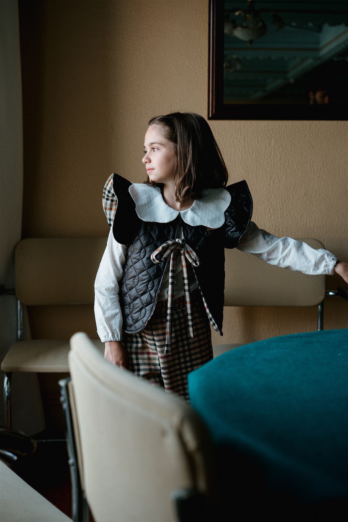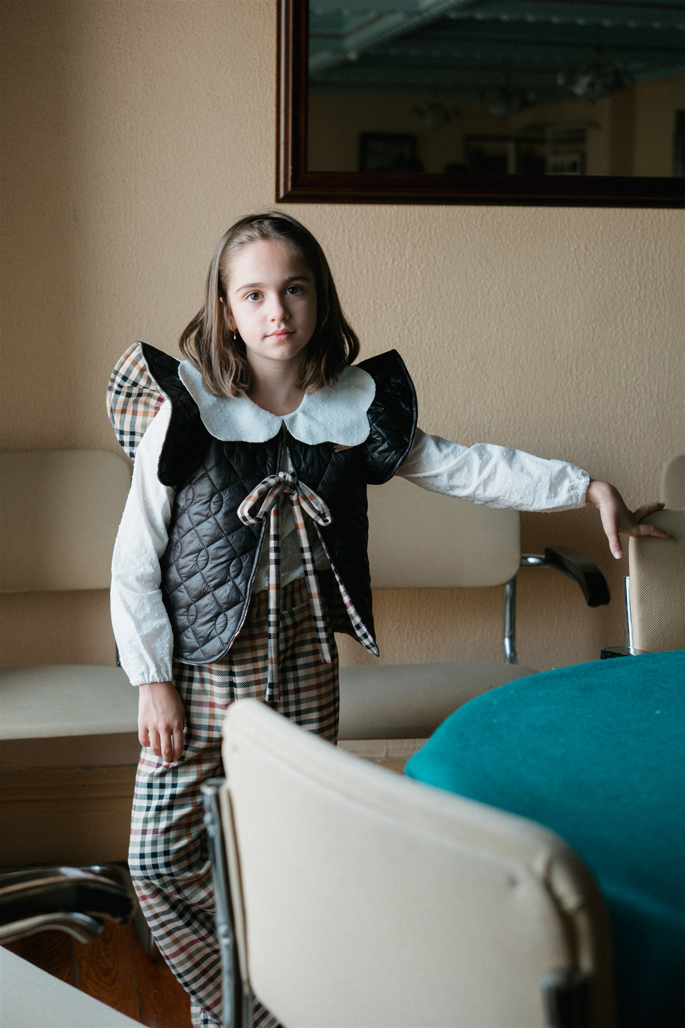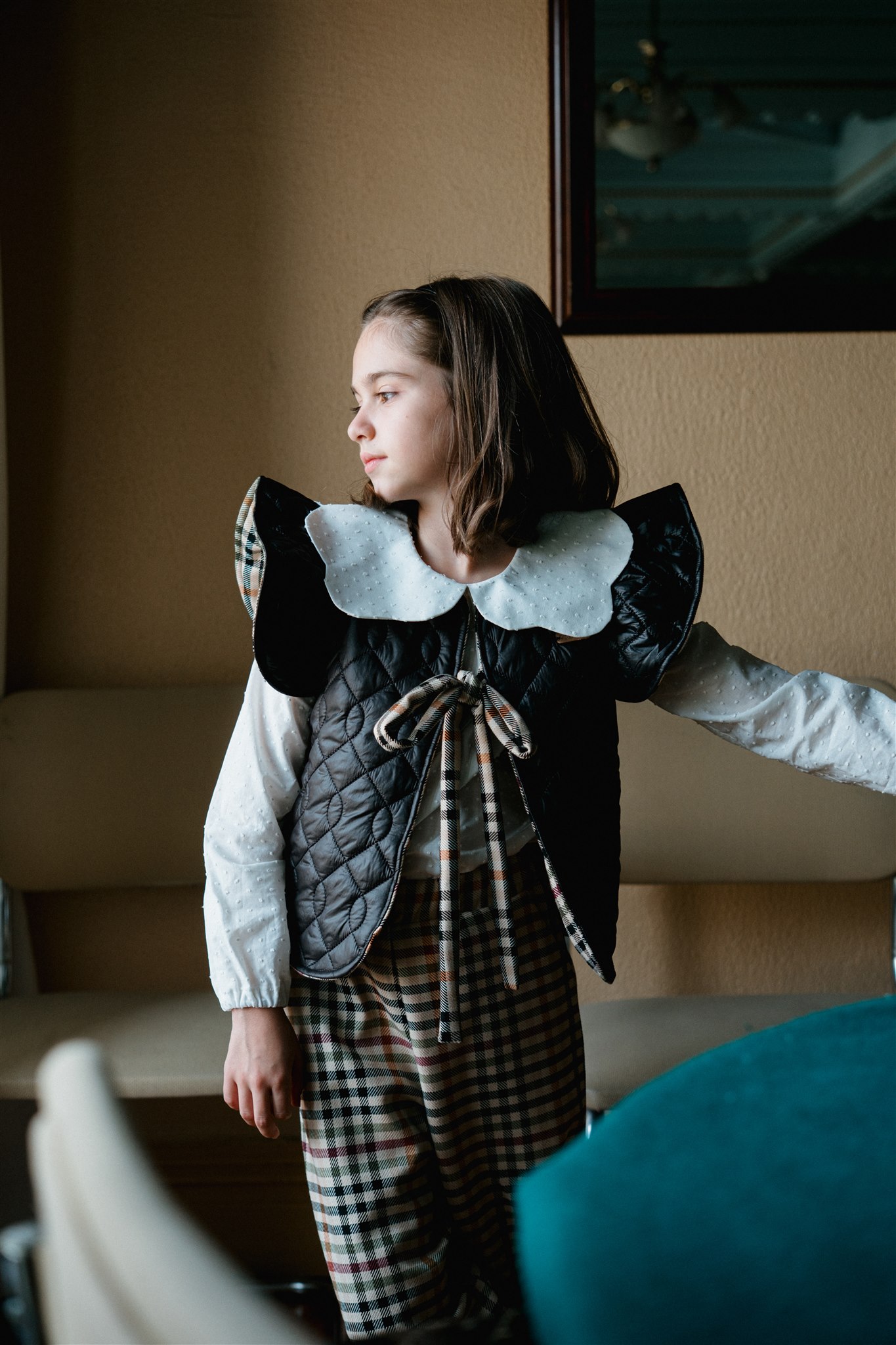 Chaleco acolchado negro reversible con gran volante en el hombro. Interior de cuadros camel y rayas negras, verdes y burdeos. Abrocha con un lazo de cuadros.