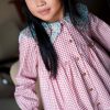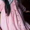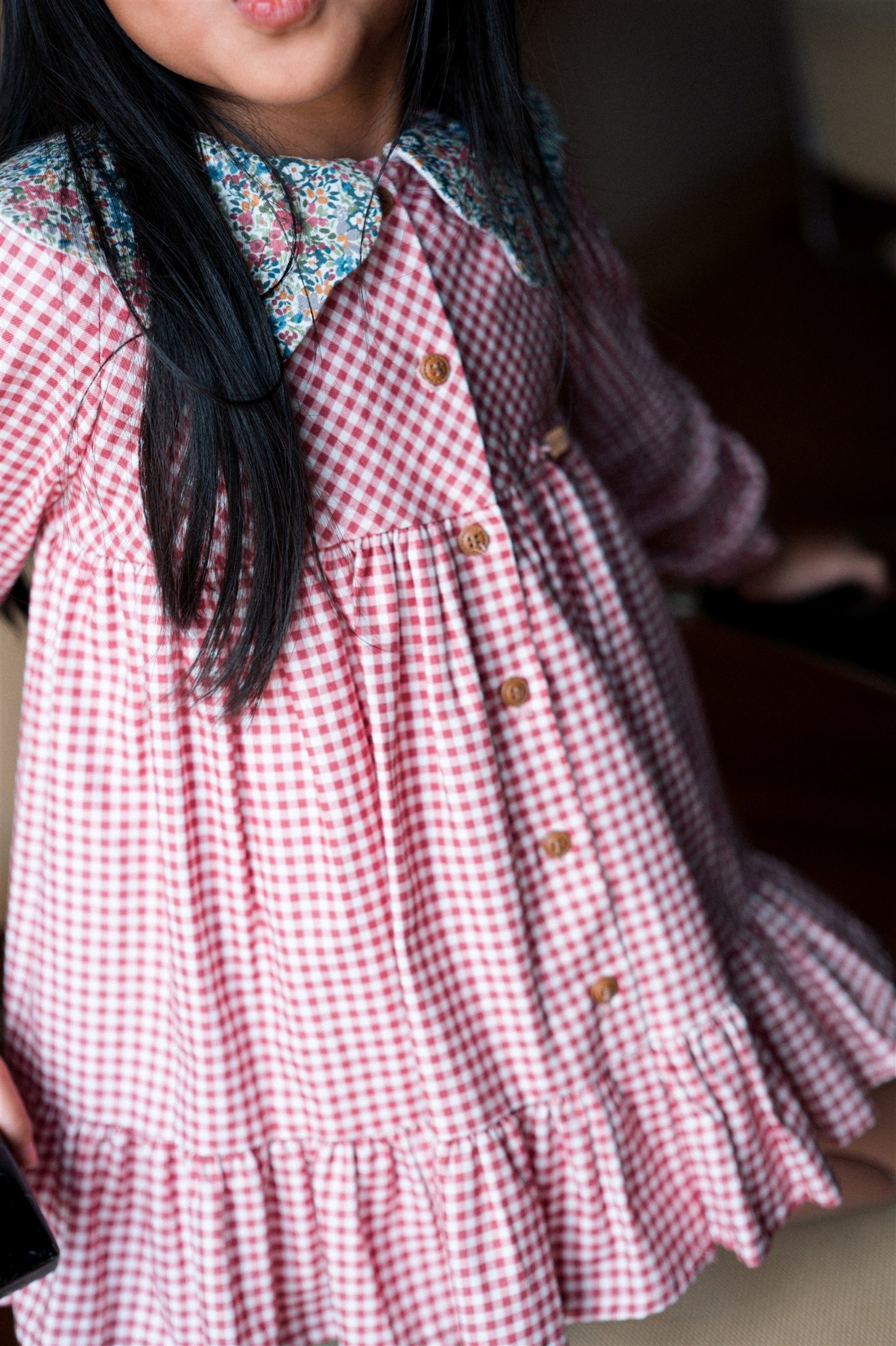 Jesusito vichy rojo franbuesa con volante en el bajo. Gran cuello de ondas estampado liberty en tonos azules, burdeos… Abrocha a lo largo del delantero.