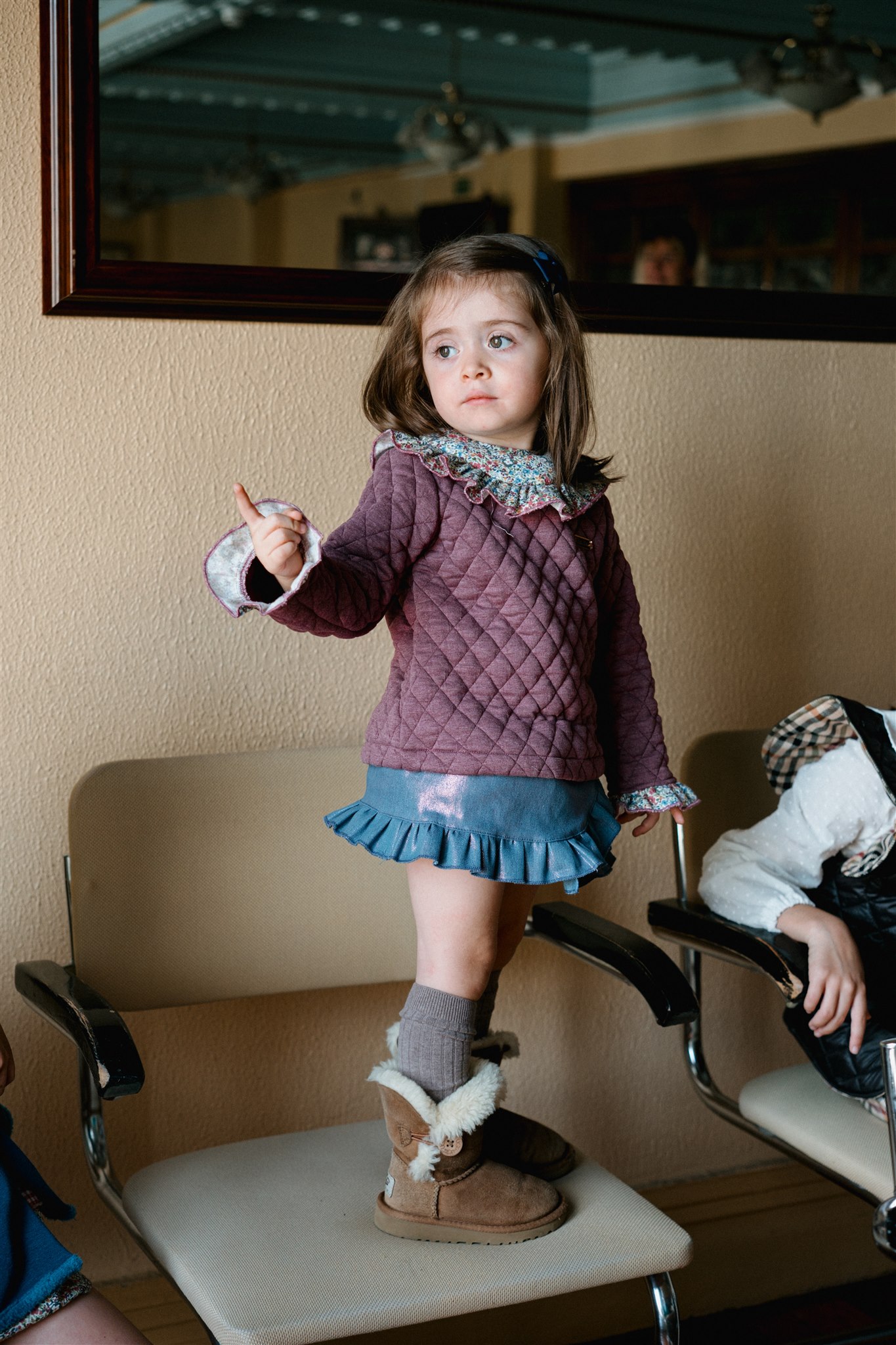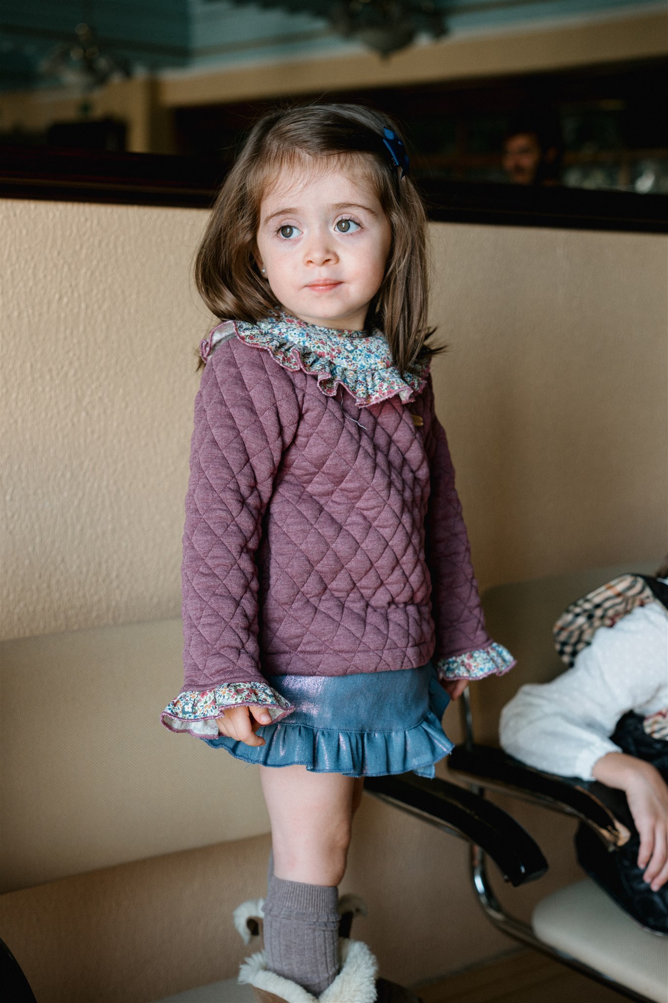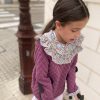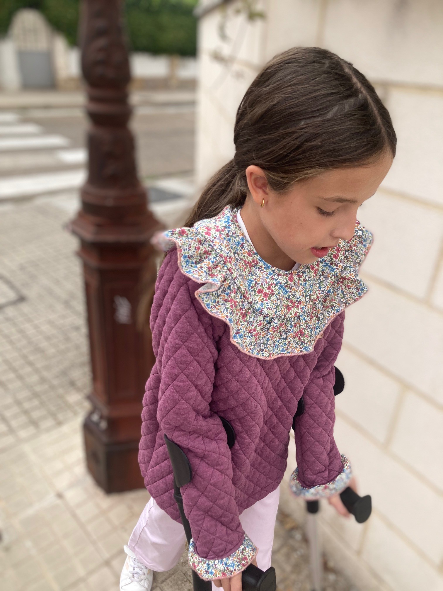 Sudadera rombo color berenjena. Cuello liberty color rosa y azul. Manga larga con el puño volante liberty. Abrocha a lo largo de la espalda con botones símil cuero. Combina con las falditas Susitna y Kobuk.