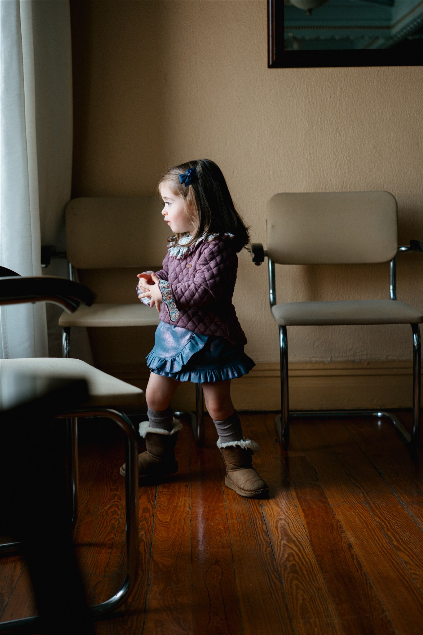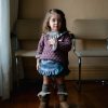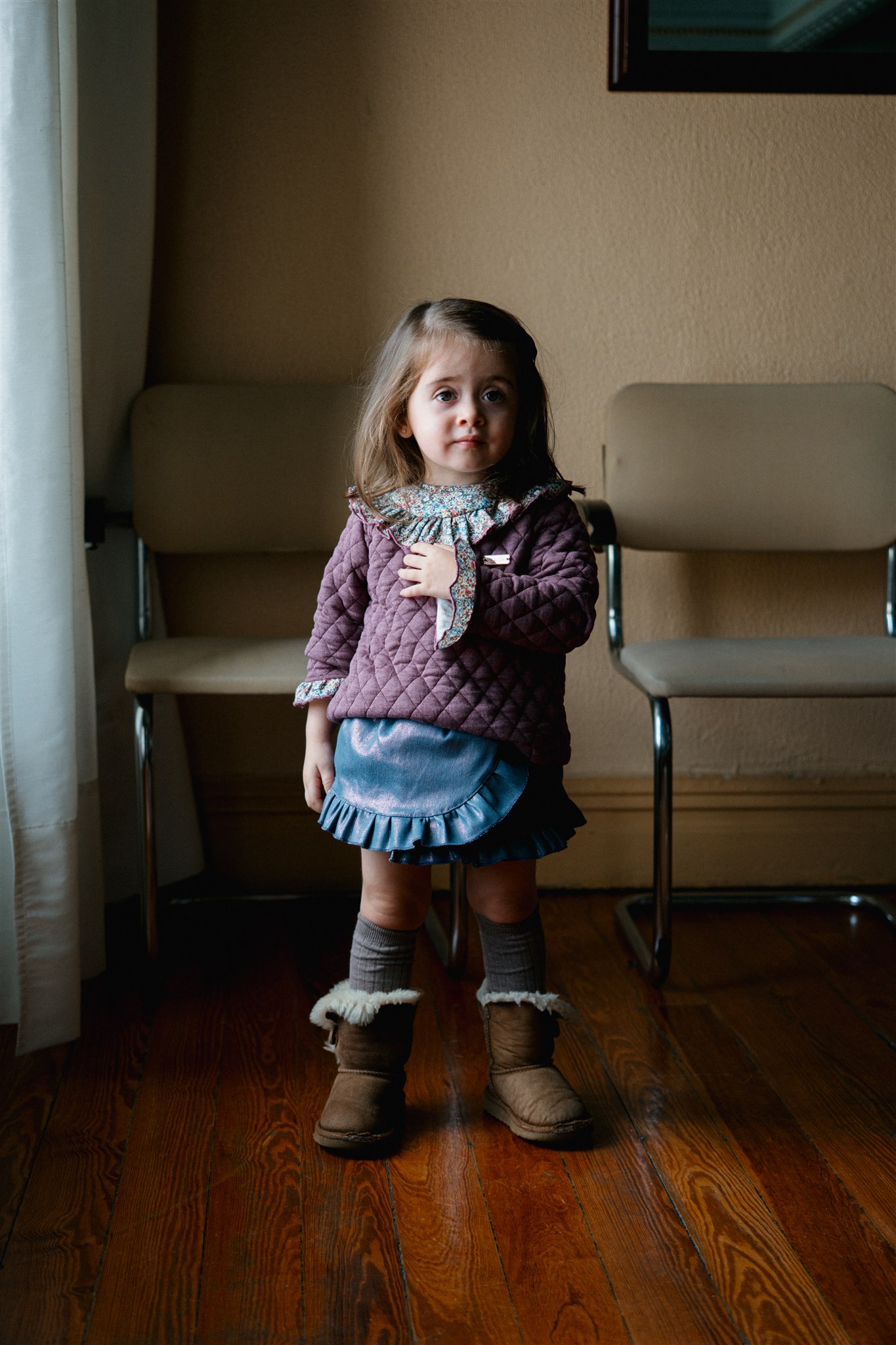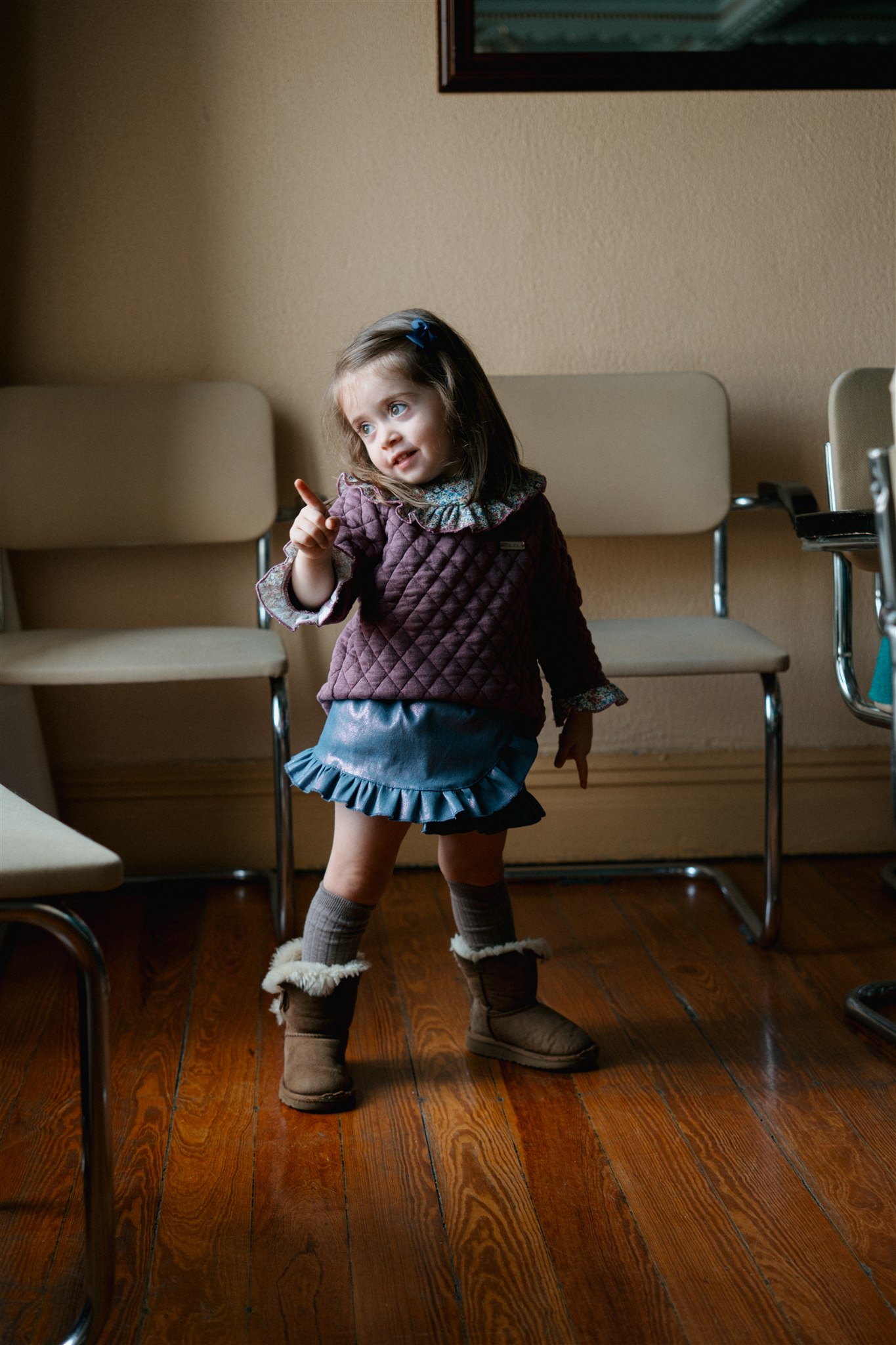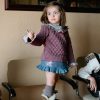 Sudadera rombo color berenjena. Cuello liberty color rosa y azul. Manga larga con el puño volante liberty. Abrocha a lo largo de la espalda con botones símil cuero. Combina con las falditas Susitna y Kobuk.