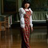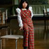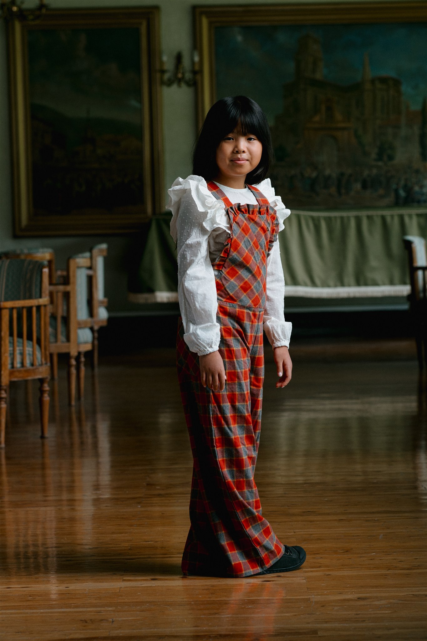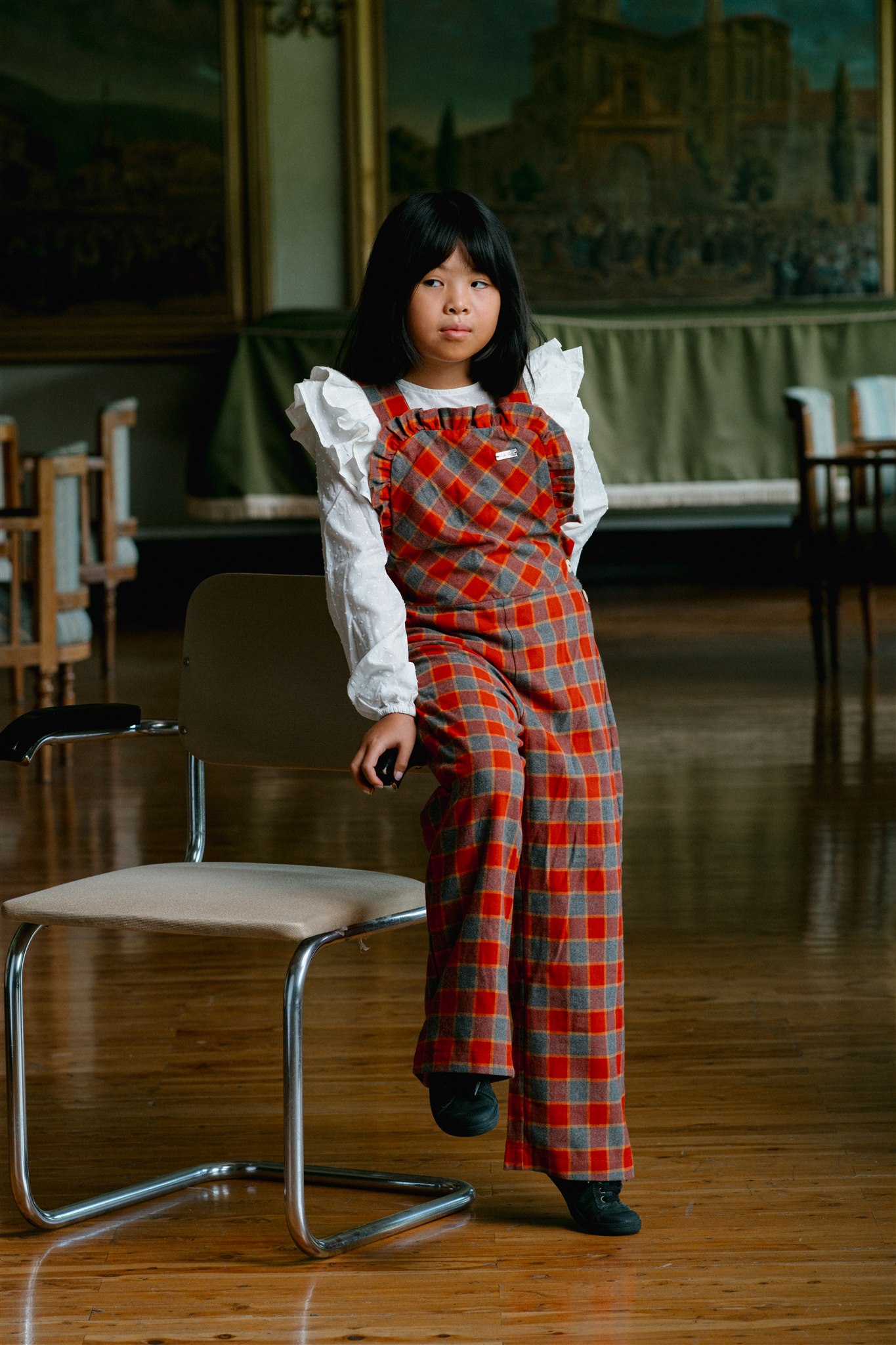 Peto con tirantes cruzados en la espalda. Se regula con botones y ojales a diferentes alturas para que se adapte al crecimiento. Durará más de una temporada. Los cuadros son de color teja con rayas grises y mostazas. El canesú es redondeado con volante alrededor.