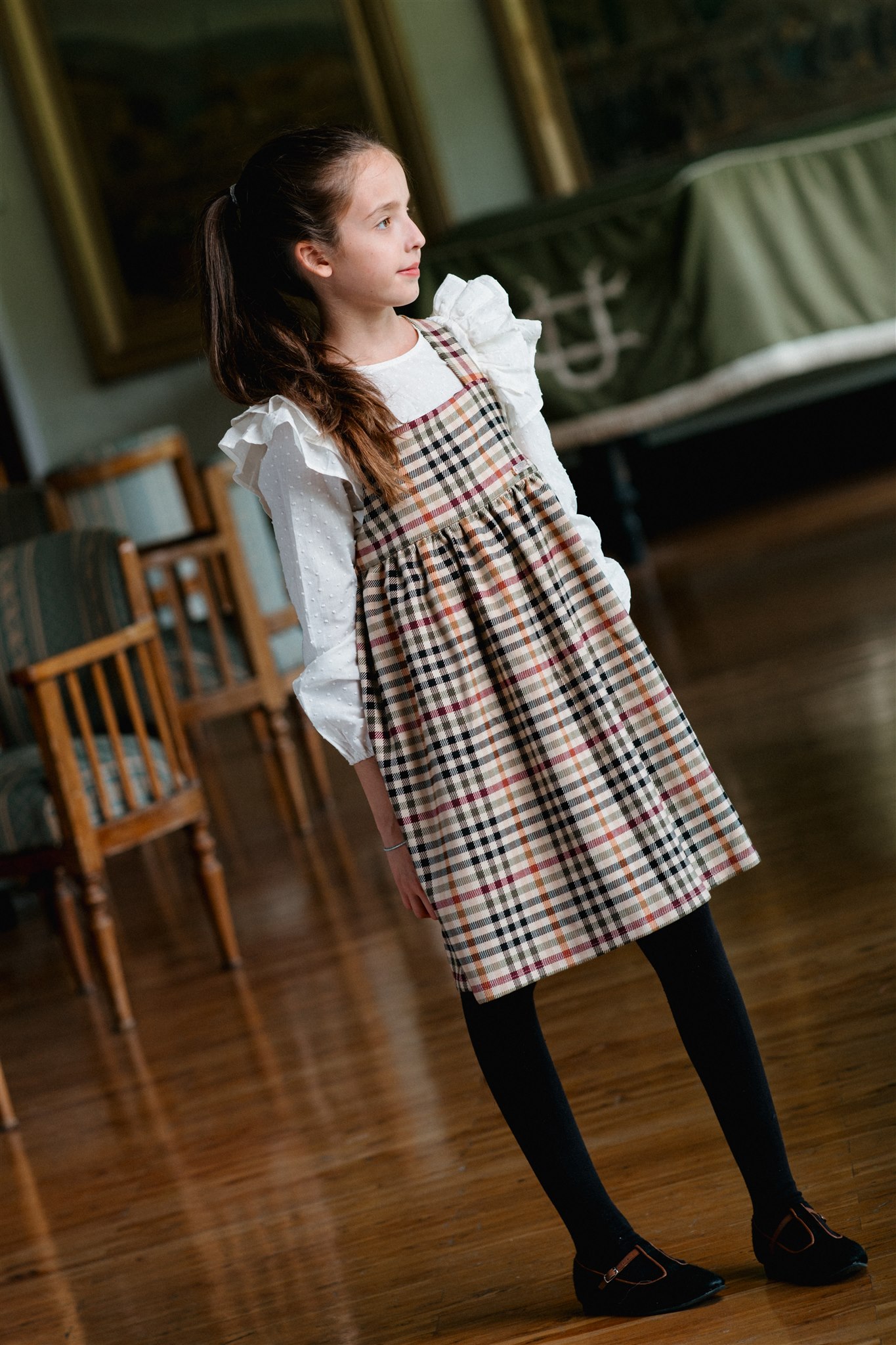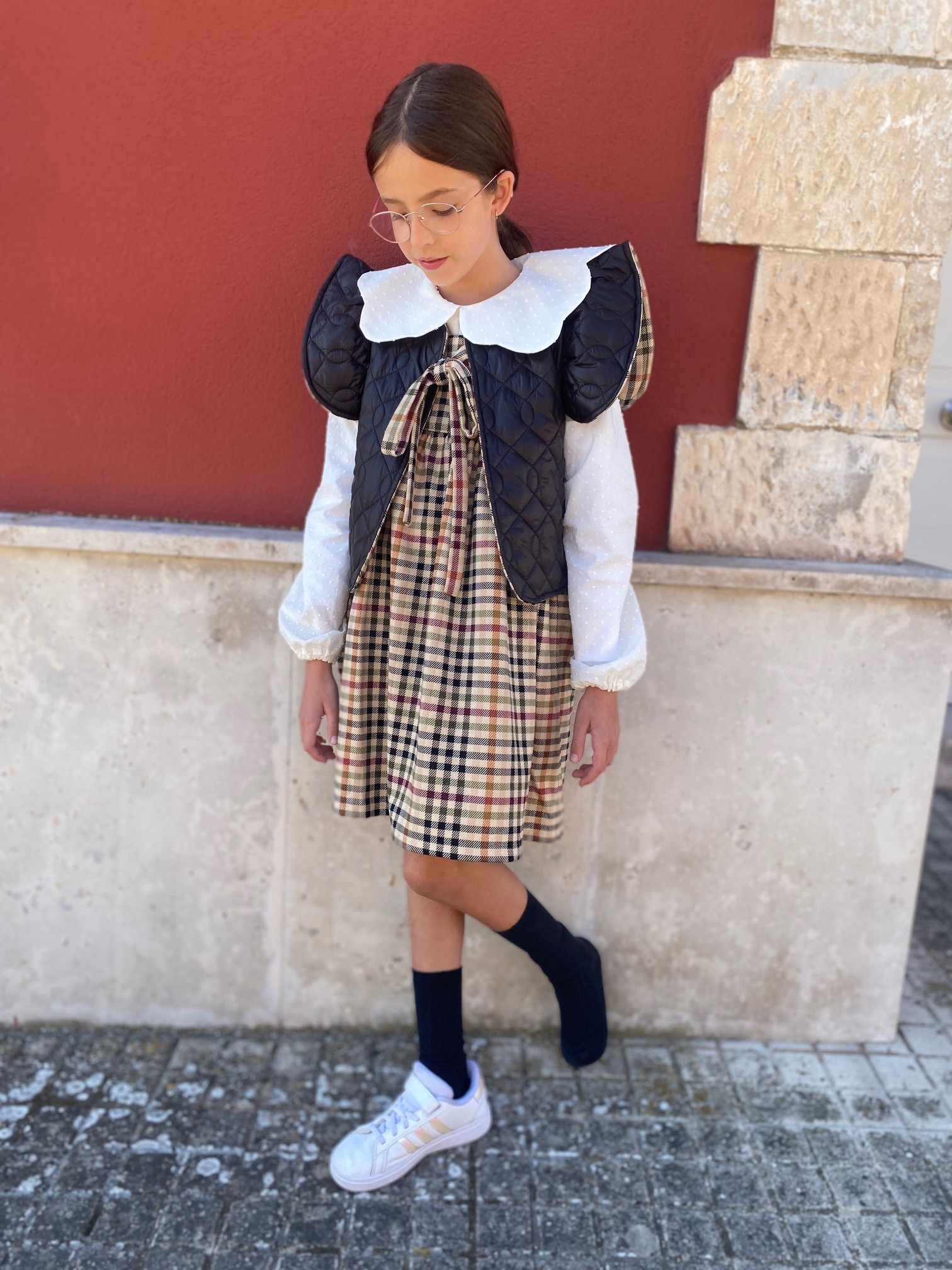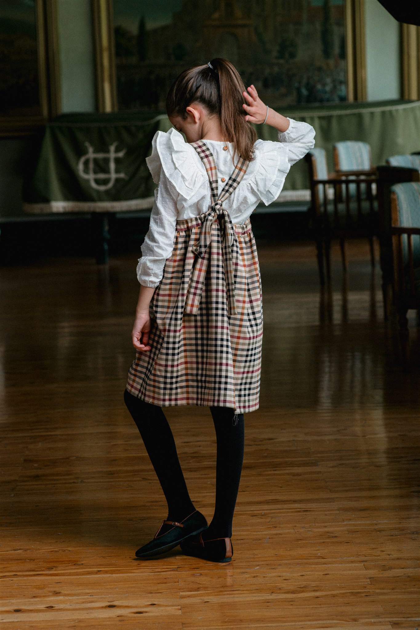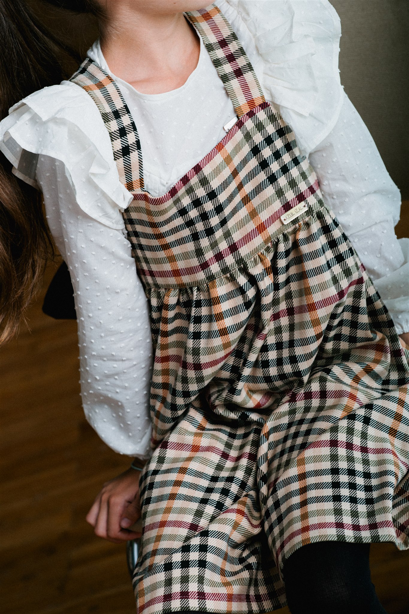 Pichi de cuadros grandes y fondo camel. Las rayas son de color negro, verde y burdeos.