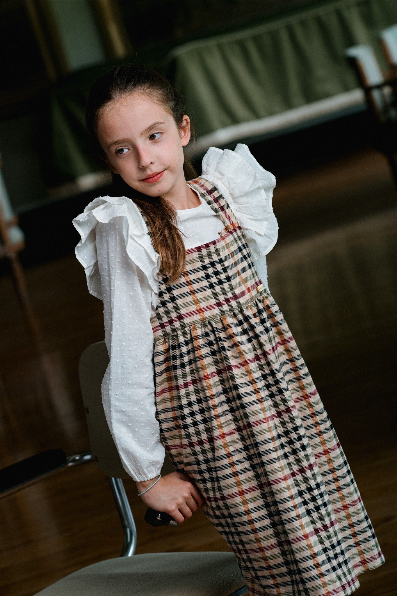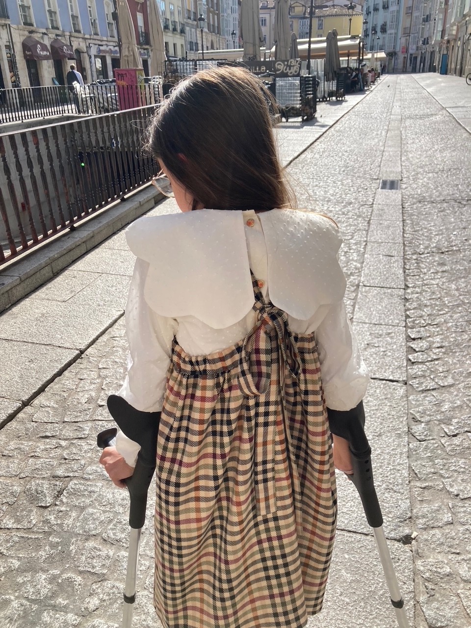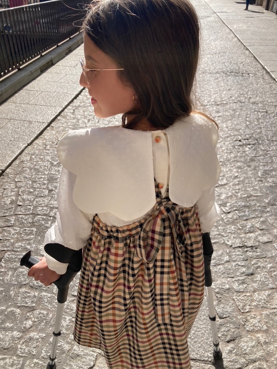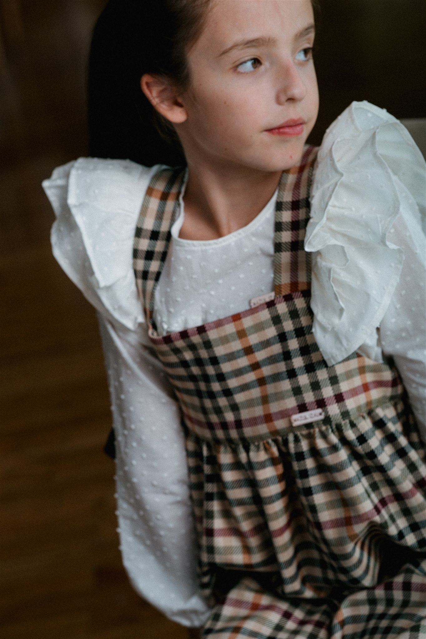 Pichi de cuadros grandes y fondo camel. Las rayas son de color negro, verde y burdeos.