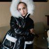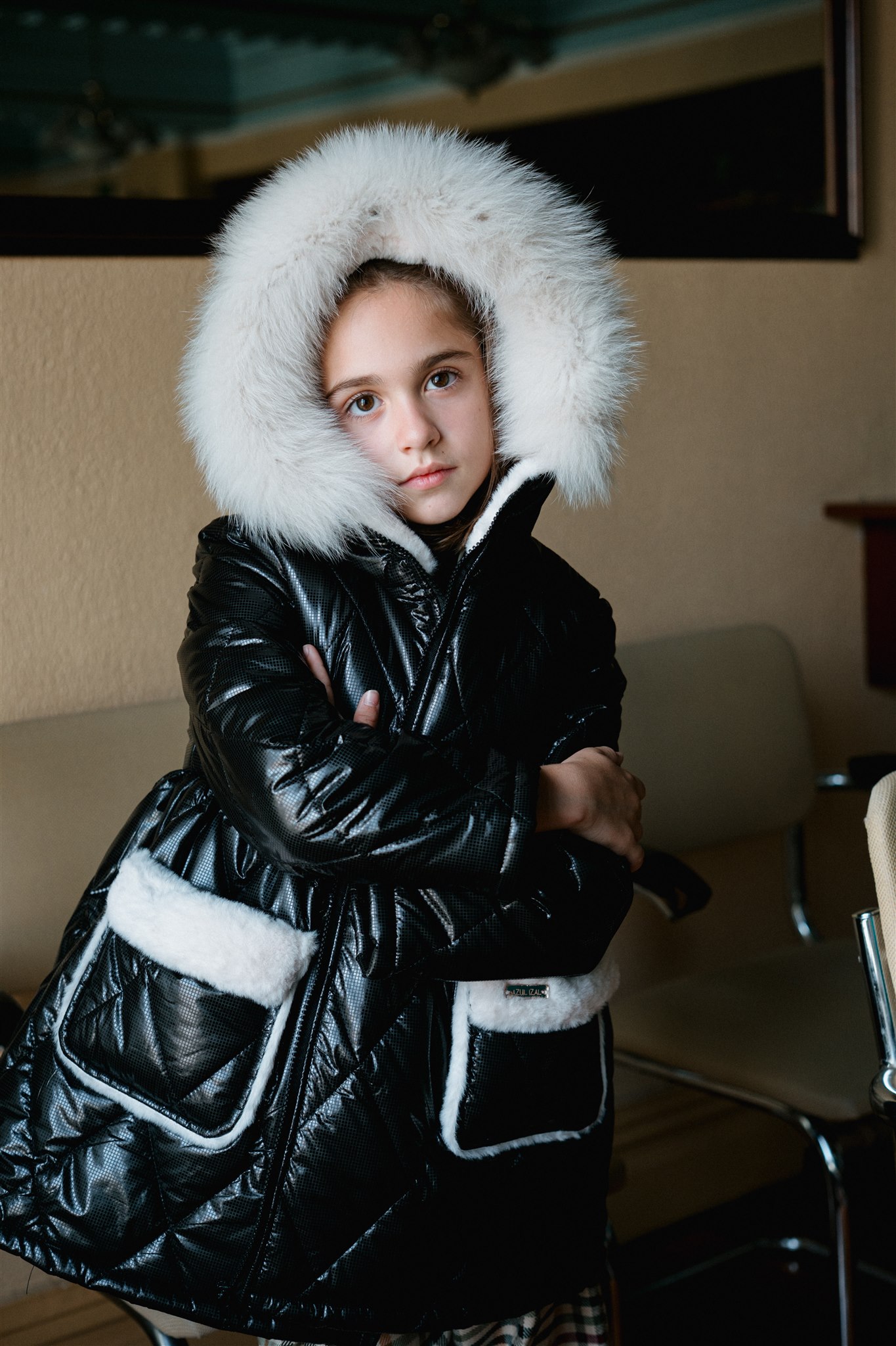 Abrigo acolchado negro con corte y vuelo en la cintura.  Peluche crudo en el interior. Abrocha con cremallera. La capucha tiene pelo natural y se desmontan para poder meter en la lavadora.
