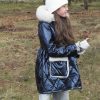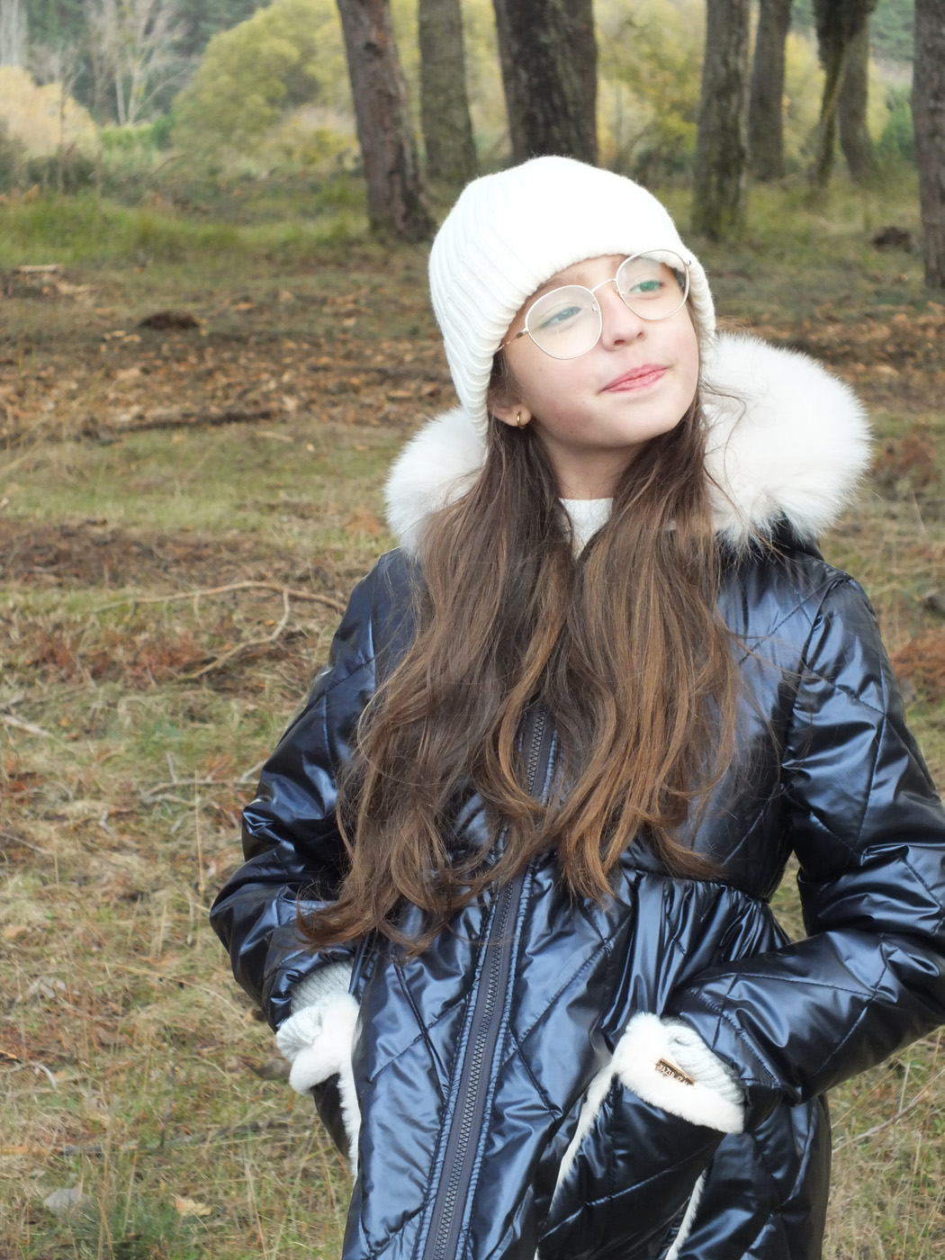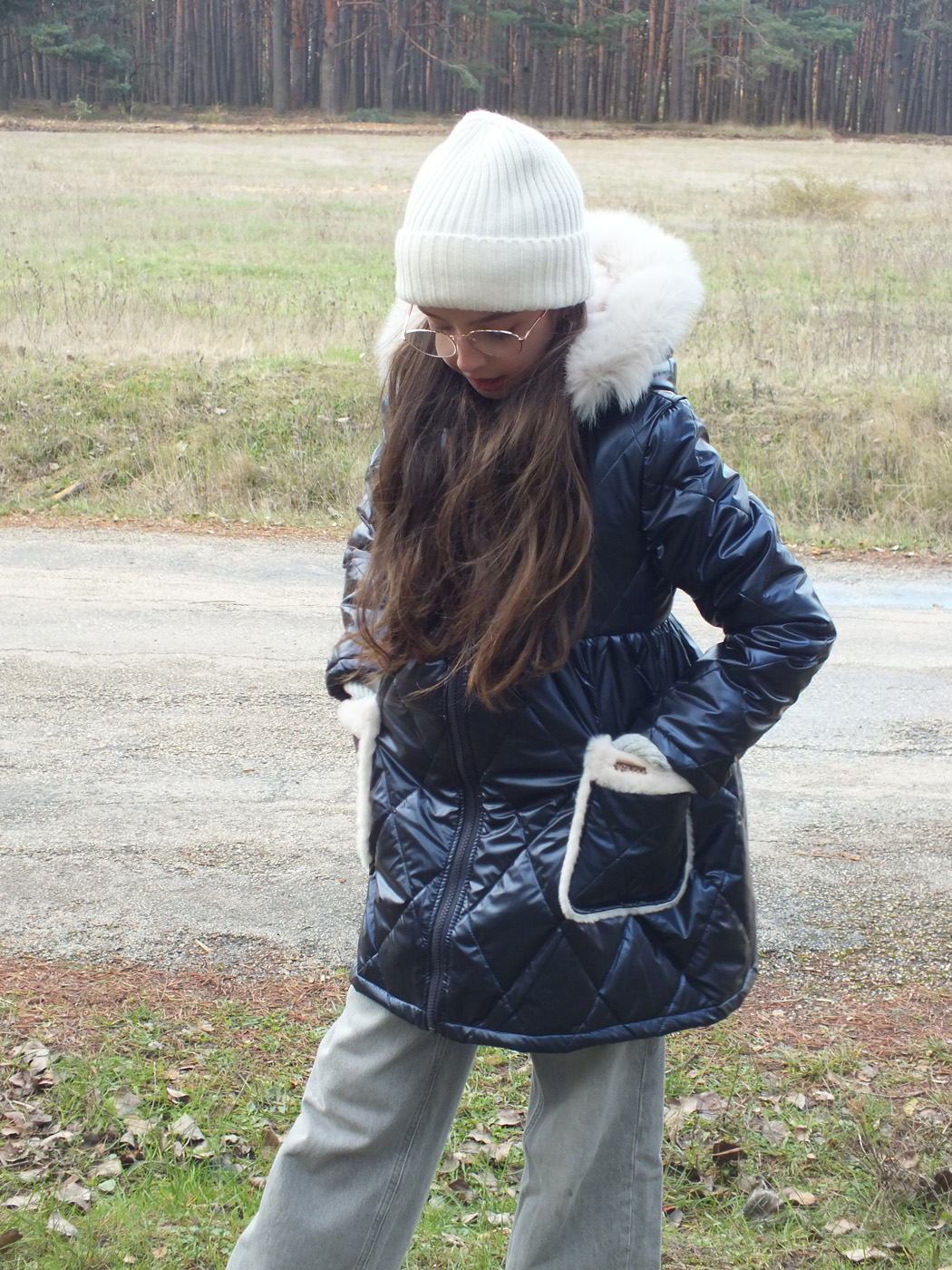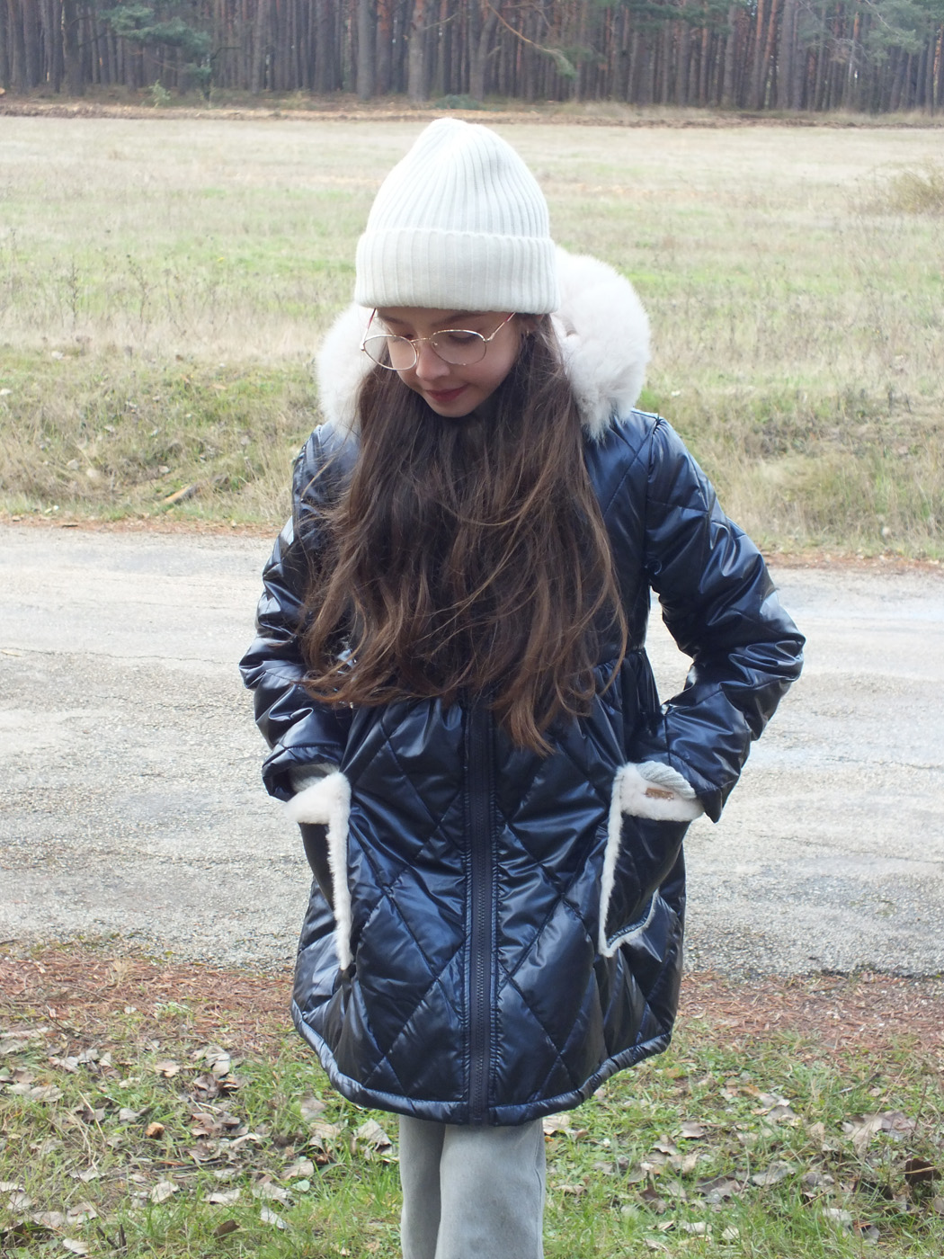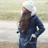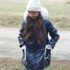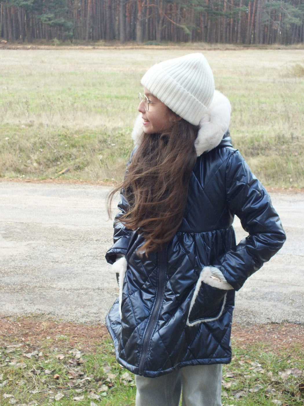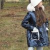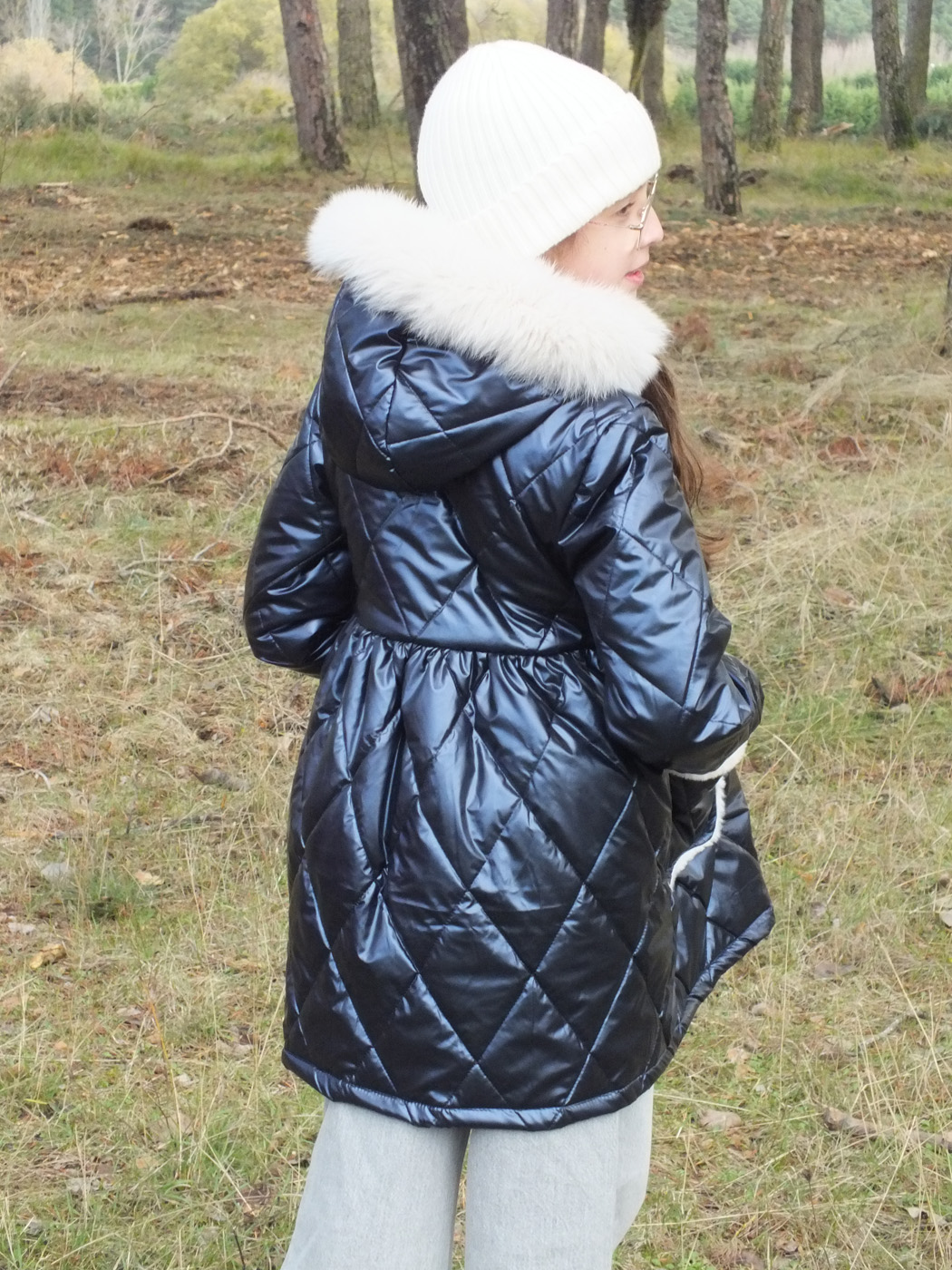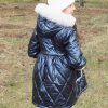 Abrigo acolchado marino con corte y vuelo en la cintura.  Peluche crudo en el interior. Abrocha con cremallera. La capucha tiene pelo natural y se desmontan para poder meter en la lavadora.