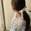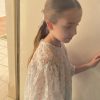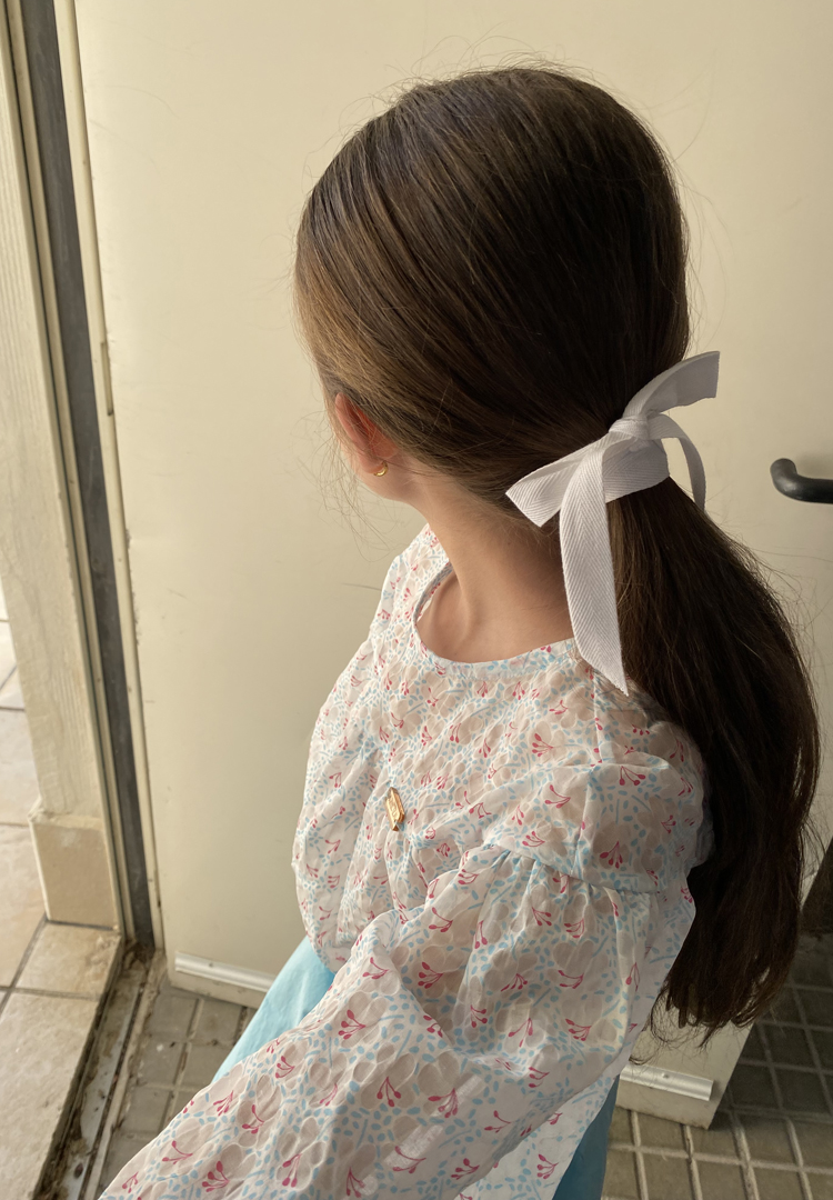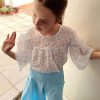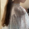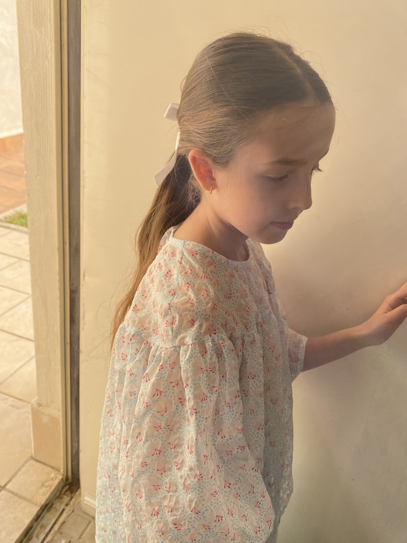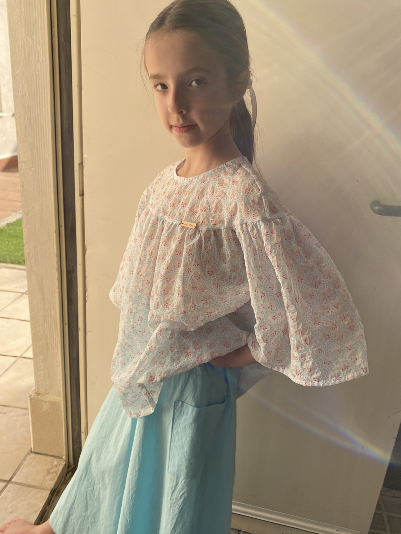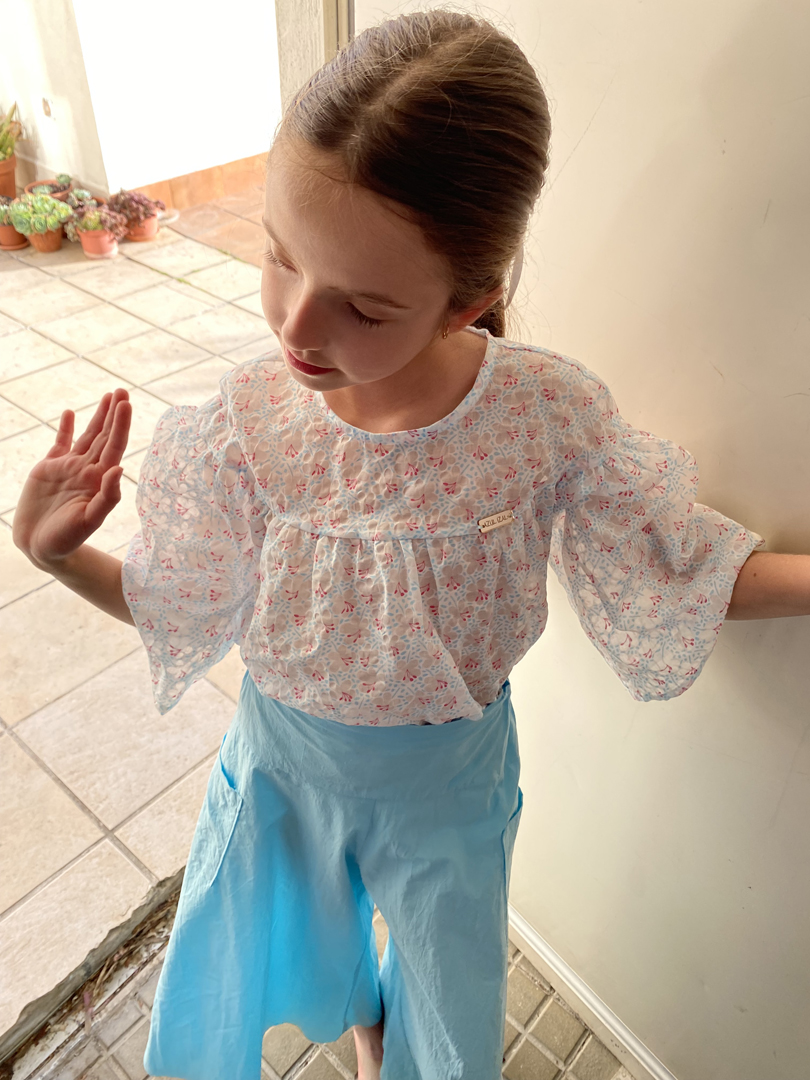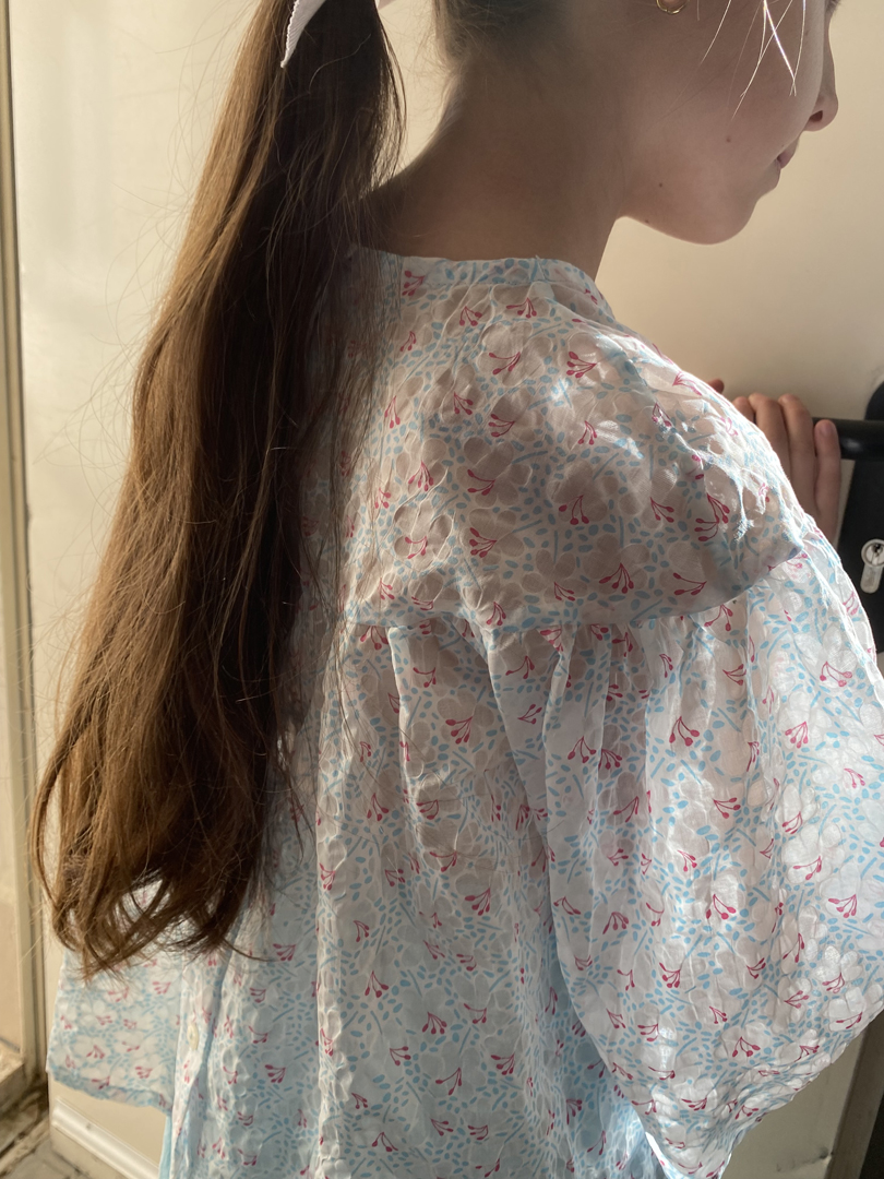 Blusa de organza estampado flor rosa y fondo celeste. Canesú fruncido.  Escote redondo y manga acampanada hasta el codo. Abrocha a lo largo de la espalda con botones de madera.